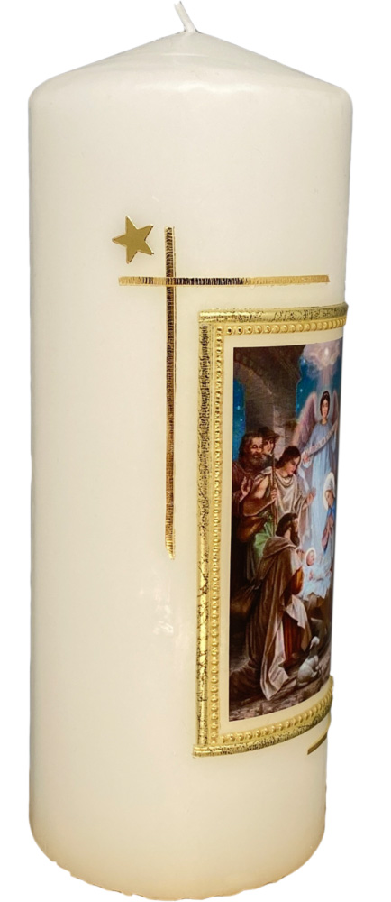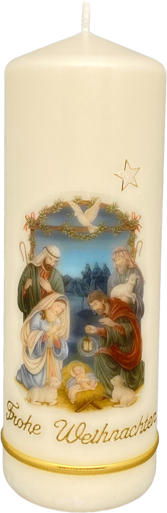 Weihnachtskerze "Anbetung der Hirten" mit Schriftzug "Frohe Weihnachten"